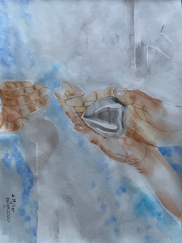 By this time, in April, it was nearing our anniversary in the 23rd. My heart, gut and prayers were full of emotions. When Rodney died, he was cremated and his ashes were split up into 4 containers. 3 of them were heart shaped urns, one for me and one for each son Christopher and Matthew, and one to be interred at the National Cemetery. During his memorial service, I asked my nephew Jonathan to take some photos and one of them was of me holding his ashes in my hand. This photo became the inspiration for the painting. The exercise from the 7th grade of drawing a hand came back! When I had the 2 hands and the heart drawn, it looked and felt lacking to me. I added an outstretched hand. These hands have many meanings for me..giving my heart, the love of my life to God; God giving His heart to me; being vulnérable, etc. There is really no orientation of this painting..I didn’t plan on that..in fact if you look closely there are some clouds that were planned in one orientation..I like it better in the Omni-directional version! So many emotions came out as I painted this..they seemed to flow from my heart, through the brush and onto the paper. You will always be the love of my life Rodney, always have my heart, and I will always have yours. Always.