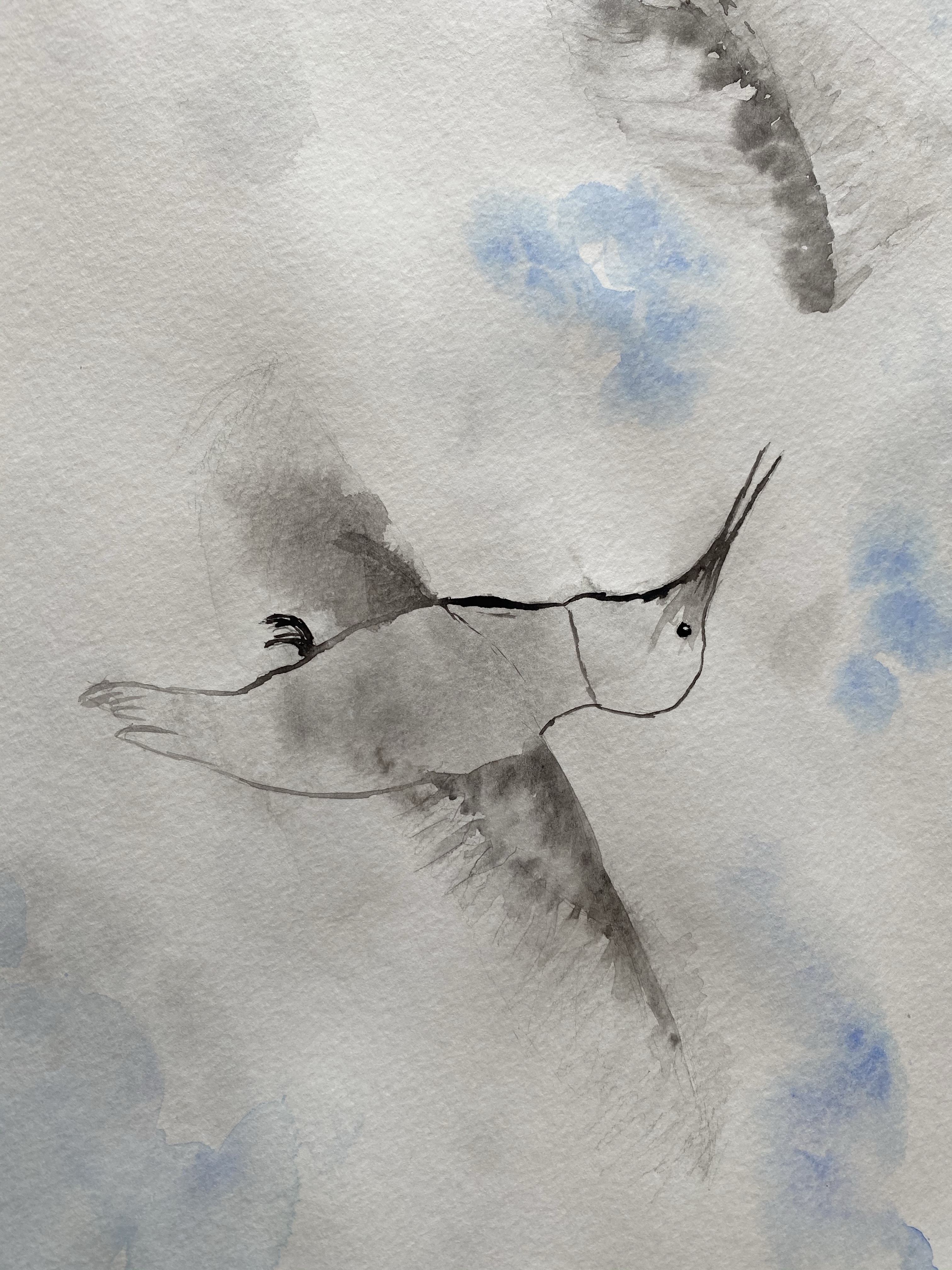This started out to be 2 humming birds in flight, inspired by some photos I took a long time ago in Lexington, SC. After I had the basic outline, I just wasn’t feeling it to continue..so I stopped..a simple expression of freedom, flight, blue sky hope.