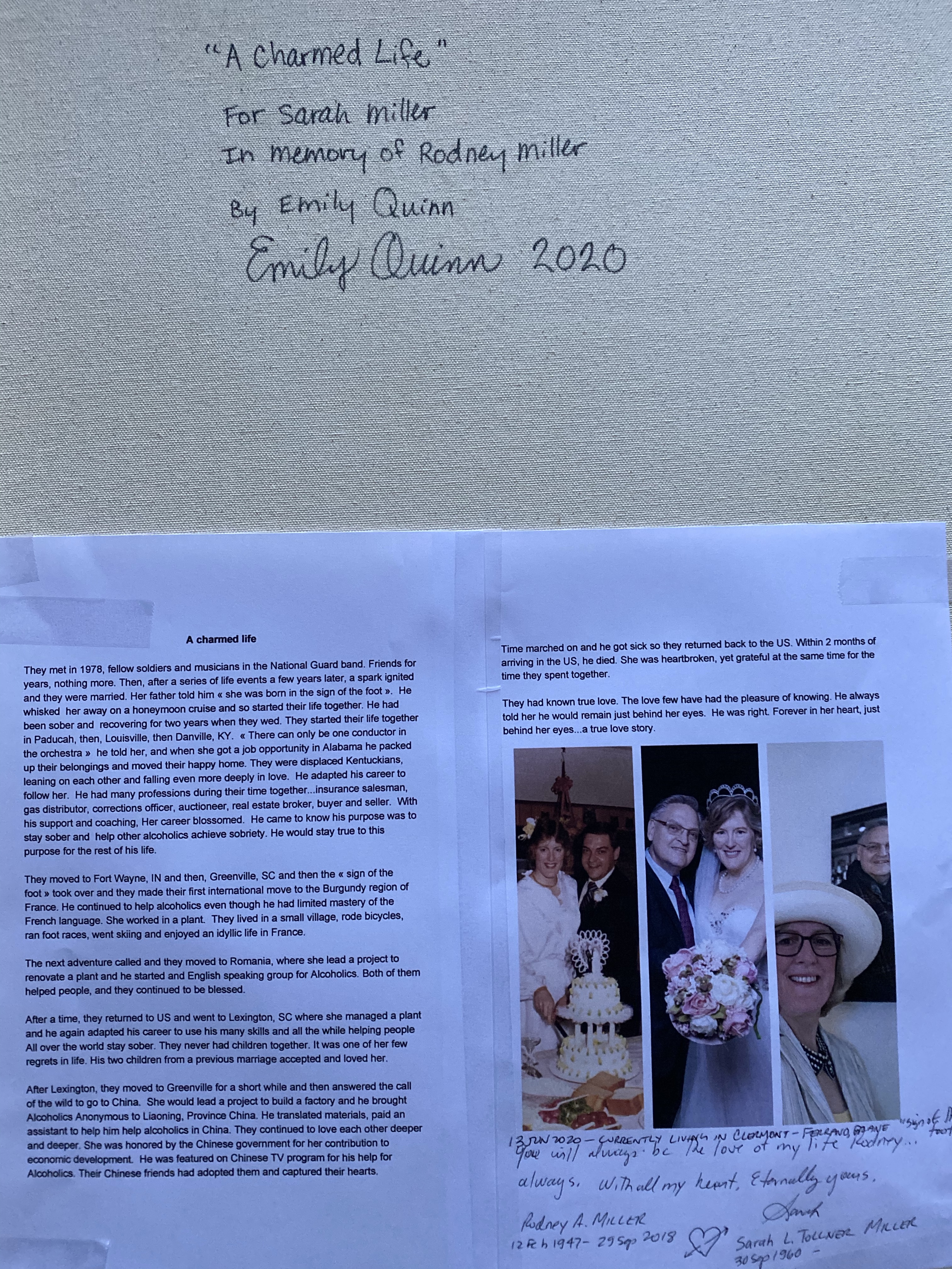 After Lexington, they moved to Greenville for a short while and then answered the call of the wild to go to China. She would lead a project to build a factory and he brought Alcoholics Anonymous to Liaoning, Province China. He translated materials, paid an assistant to help him help alcoholics in China. They continued to love each other deeper and deeper. She was honored by the Chinese government for her contribution to economic development. He was featured on Chinese TV program for his help for Alcoholics. Their Chinese friends had adopted them and captured their hearts.